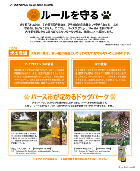 オーストラリア・パースでは公園やビーチなどでたくさんの犬を目にする機会が多く、犬がより人の暮らしに密接しているように思います。では、なぜそれができるのか?それは、犬種の登録や管理などを行い、純血種を守ること、ルールや法律を守ること、しつけを通して犬との生活を守ること、そして飼育放棄や虐待などから犬を守ることなど、【4つの守る】を実践しているからかもしれません。そこで、今号特集では「パースで犬といっしょに暮らす」ためのその【4つの守る】を犬に関する協会や団体、組織などにお話しを伺い、“犬と人の密接した暮らし”のヒントを紹介します。日豪での犬に対する意識の違いも垣間見られたらと思います。