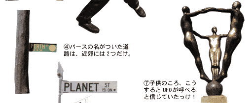 | 3時間のドライブ中、道路のあちらこちらで“???”なモノを発見。せっかくだから紹介するけれど、場所はひとまず内緒。なーんにもすることがなかったら、このページを片手にサイン探しでヒマつぶしはどう? フリーマントルから98番バスに乗れば、番号順にサインが見つかるよ。 |