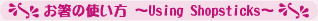 | Washoku (Japanese food) is very popular in Australia. When you have Japanese food, you may use Hashi (chopsticks). According to the "Washoku hukyuu kyoukai"(Washoku promotion commission), to use hashi functionally, you should fix under chopstick and move only upper chopstick. If you should use them as described below. Using Chopsticks → |