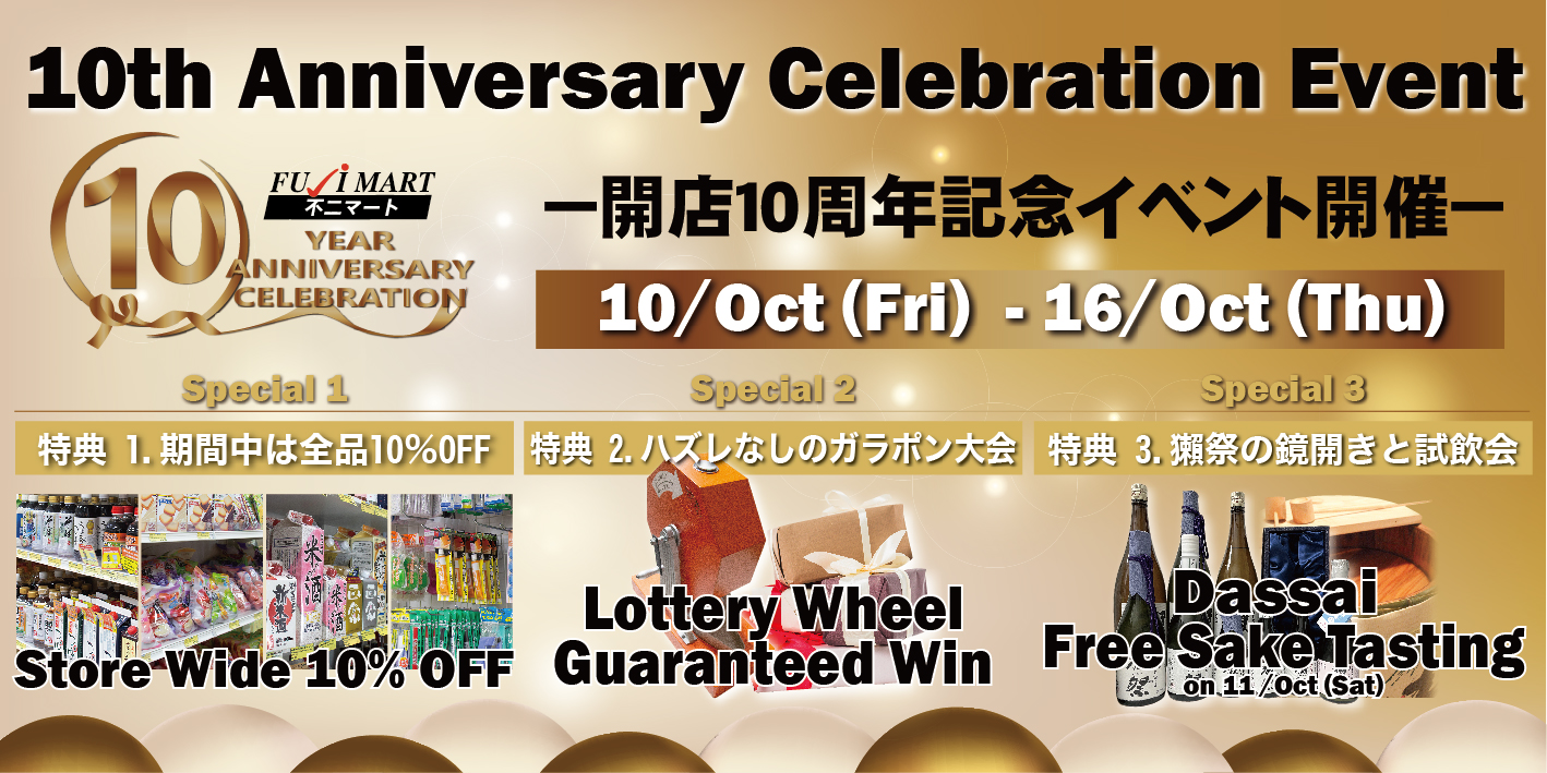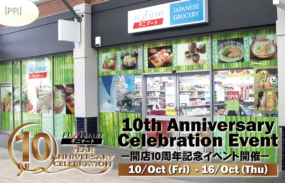 2015年5月に開業した「不二マート(Fuji Mart)」は、日本文化や日本食の発信地としてパースの多くの人たちに“日本”を提供してきました。その不二マートが10年のご愛顧に感謝して、開店10周年記念イベントを開催します。イベントでは3つの特典をお客さん還元します。